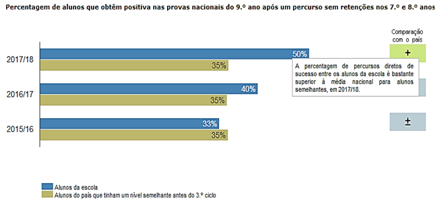 A análise dos dados disponíveis no portal “Infoescolas”, relativamente a “Percursos diretos de sucesso”, revela que o agrupamento apresenta resultados muito favoráveis e robustos, relativamente aos dados nacionais, espelhando uma evolução positiva nos últimos anos.
