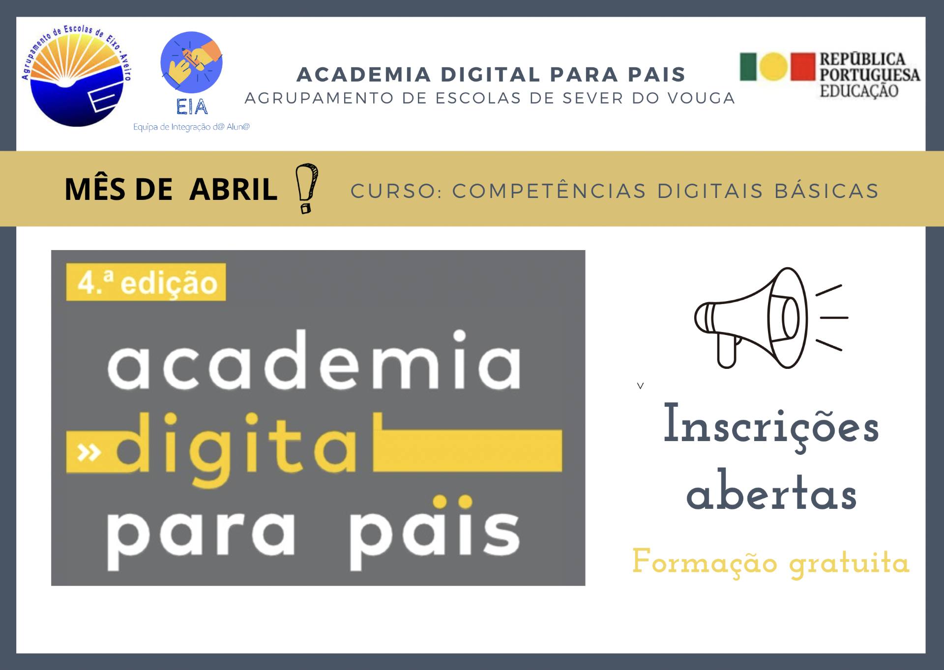 À semelhança do ano letivo transato, o AEEixo volta a promover, no decorrer do mês de abril, a Academia Digital para Pais! Com o objetivo de capacitar Pais e Encarregados de Educação, ao nível das competências digitais básicas, estas ações de formação são gratuitas e serão realizadas em horário pós-laboral, na Escola Básica de Eixo, na nova sala - Academia Digital - equipada com computadores doados pela E-REDES.