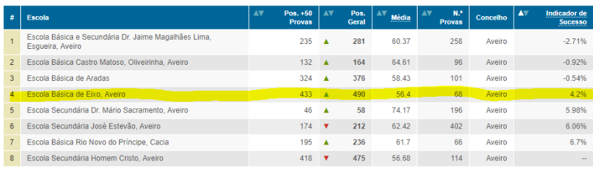 O Agrupamento de Escolas de Eixo, ao nível do “percurso direto de sucesso no 3º ciclo” tem vindo a conquistar lugares no ranking de escolas do concelho. Entende-se por percurso direto de sucesso, a obtenção de classificação positiva nas duas provas nacionais do 9º ano (Português e Matemática), após um percurso sem retenções nos 7º e 8º anos. A percentagem de alunos da nossa escola com um percurso direto de sucesso no 3º ciclo é superior à percentagem de outras escolas envolventes, conforme demostra o gráfico. Valoriza-se o trabalho dos docentes que pretendem continuar esta tendência, orientando os seus alunos para a obtenção de sucesso no 9º ano e, em simultâneo, nos exames nacionais, concluindo assim o 3º ciclo sem ficarem retidos nenhuma vez.